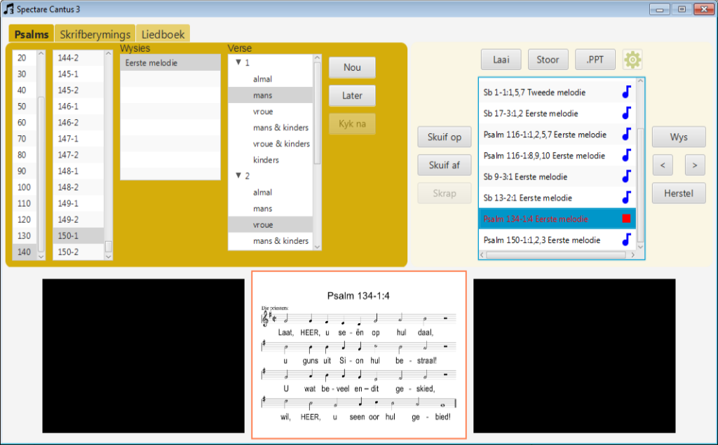Dit wys die skyfies met die note en woorde op 1 (of meer!) projektor of rekenaar skerms. Terselftertyd kan ‘n musieklĂȘer gespeel word. Laasgenoemde is handig wanneer ‘n gemeente nie ‘n orrelis beskikbaar het nie. Dit kan natuurlik ook gebruik word om uit te saai oor die internet indien die toerusting beskikbaar is.